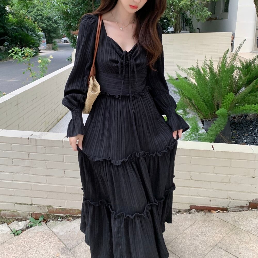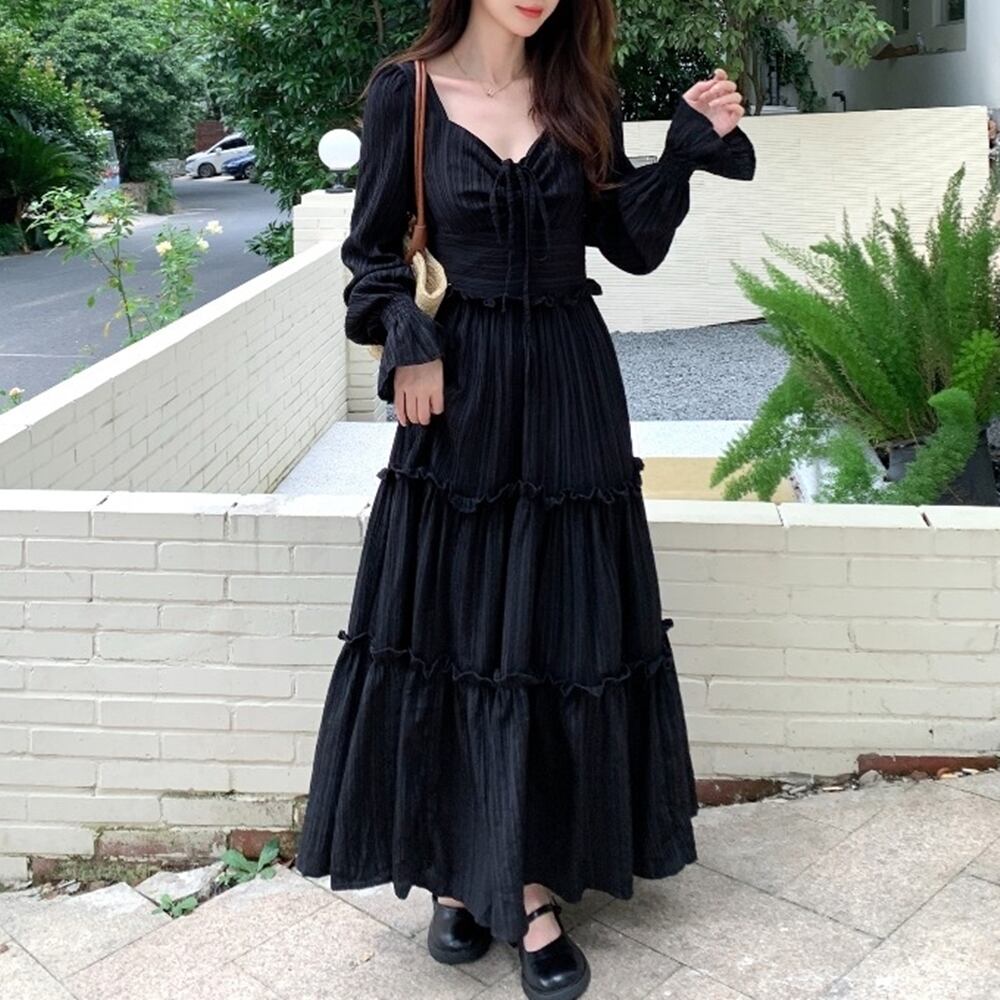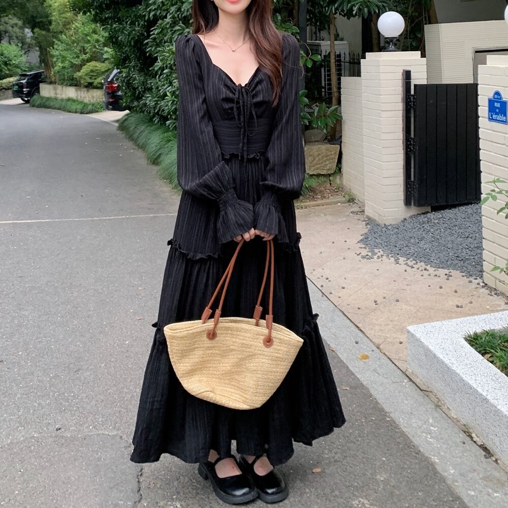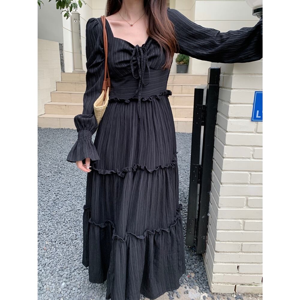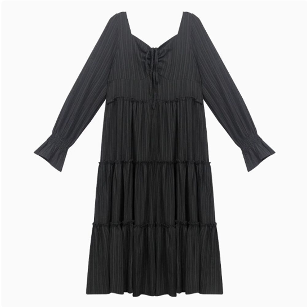 【 送料無料 】 プラスサイズ 長袖 ゆったり 細見え ウエスト ドレス ワンピース ブラック 黒 半袖 春 秋 カジュアル 可愛い かわいい コーデ 大きめサイズ 大きいサイズ 服 M1747