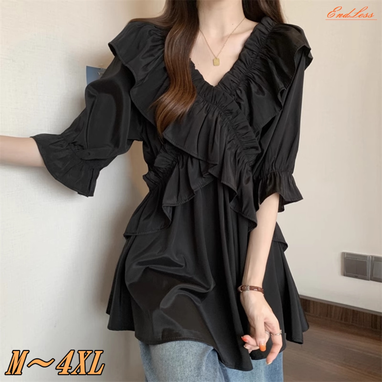 【 送料無料 】 プラスサイズ ミディ丈 フリル Vネック シャツ 半袖 トップス 夏 黒 レディース 大きいサイズの店 大きいサイズ 安い 服 重ね着 きれいめ リゾート ロング コーデ 10l 9l 8l 7l 6l 5l 4l 3l M1815