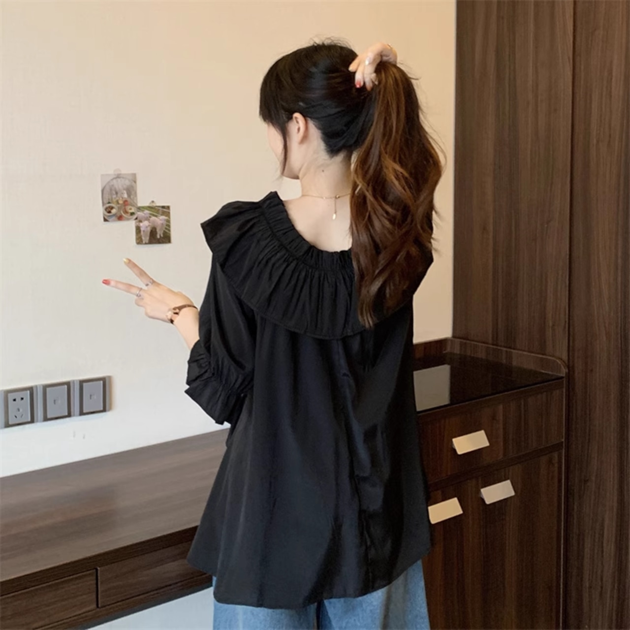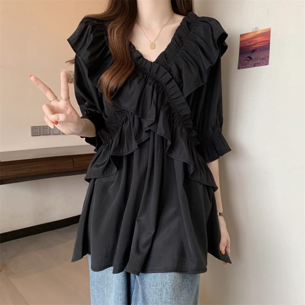 ・ウエストゆったり ブラックフリル シャツ です。