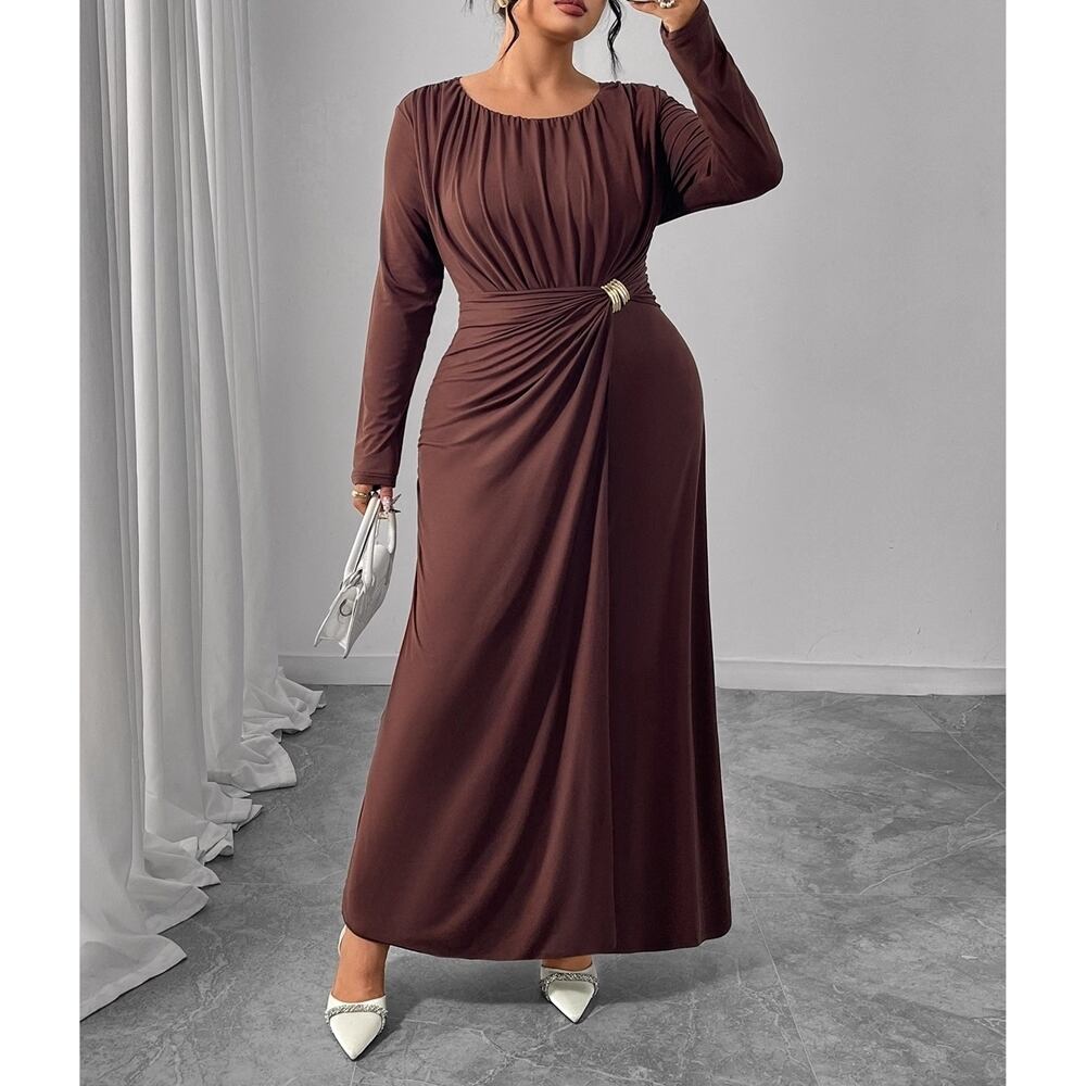 【 送料無料 】 秋 プラスサイズ ロングドレス 長袖 スリム ウエストブラウン ドレス秋服 レディース 大きいサイズの店 大きいサイズ 安い 服 重ね着 きれいめ リゾート ロング コーデ ママ 10l 9l 8l 7l 6l 5l 4l 3l M1866
