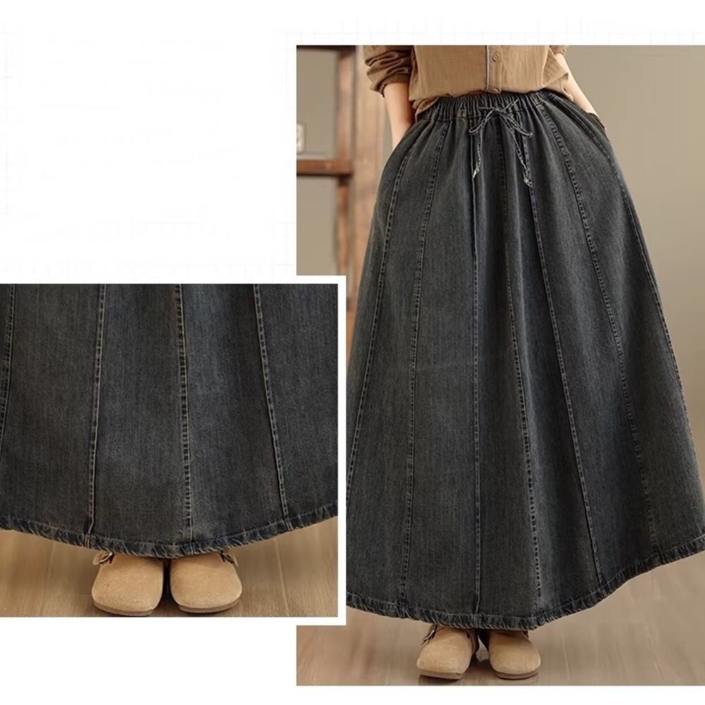 ゆったりとしたシルエットが魅力のデニムミディスカートです。伸縮性のあるウエストデザインで、さらなる快適さを実現しています。大きいサイズを取り揃えているため、多様な体型にフィットします!
