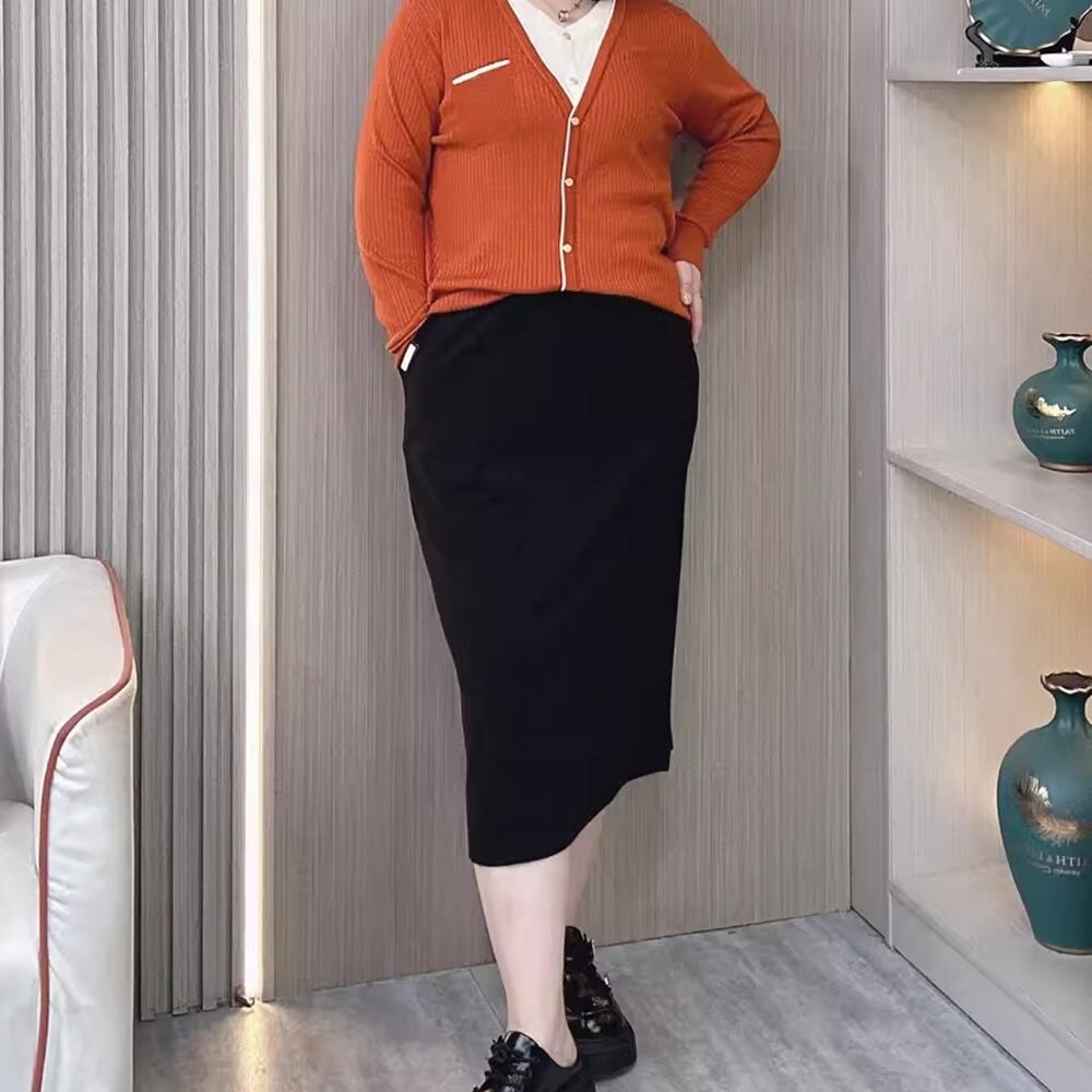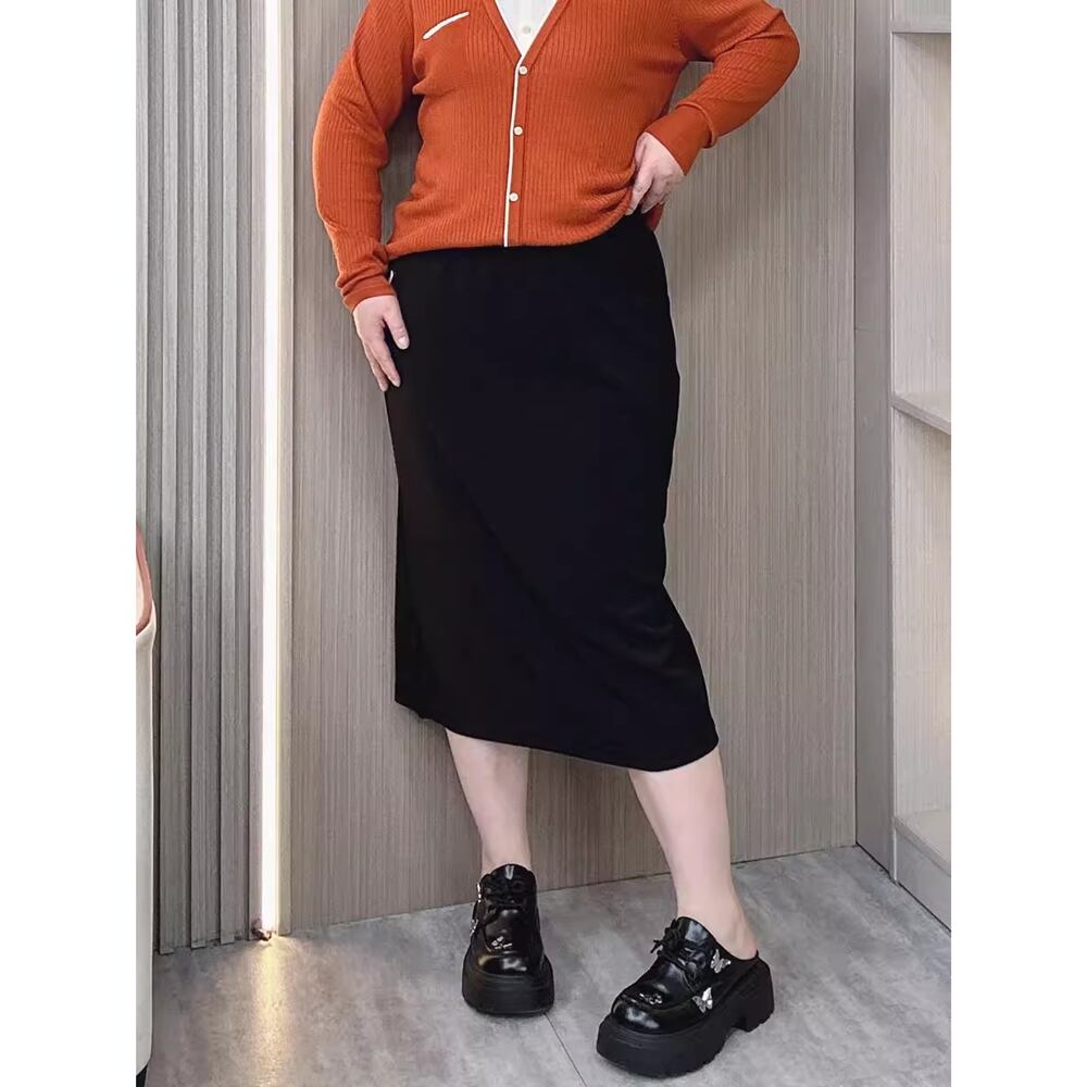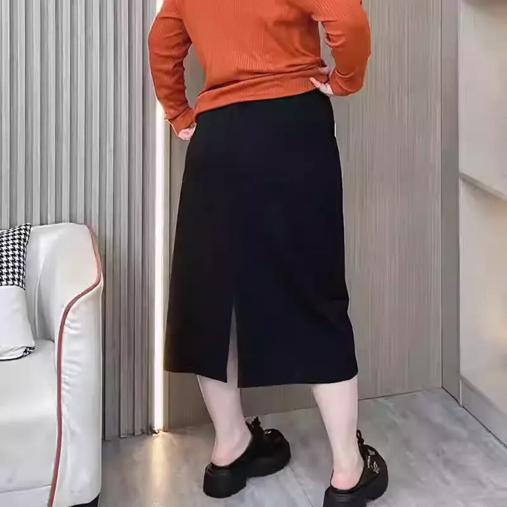春秋のファッションにぴったりな、プラスサイズのウエスト伸縮性スリミングミディスカートが新たに登場しました!