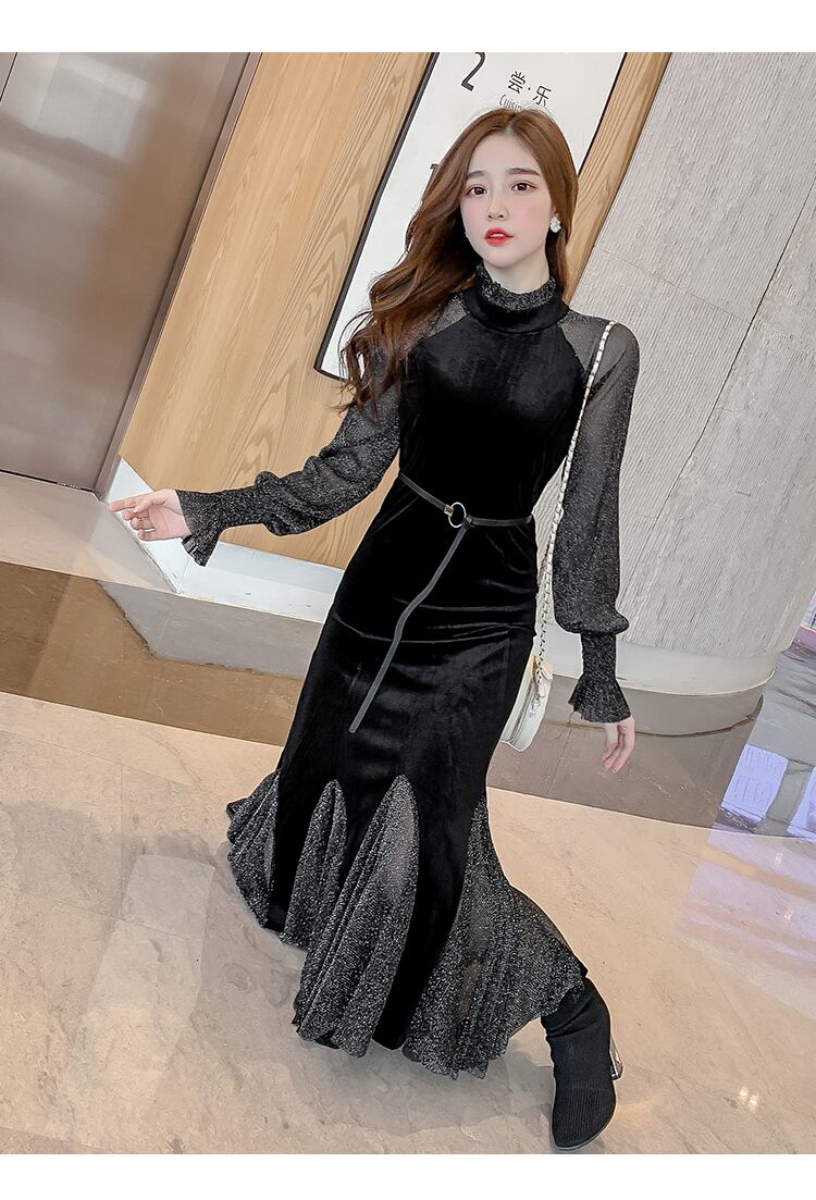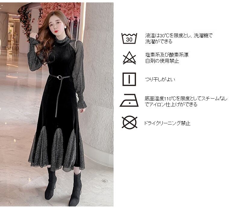 【 S 〜 2XL 】 大きいサイズ レディース フィッシュテール ロング ドレス レトロ ベルベット パーティー 長袖 70728