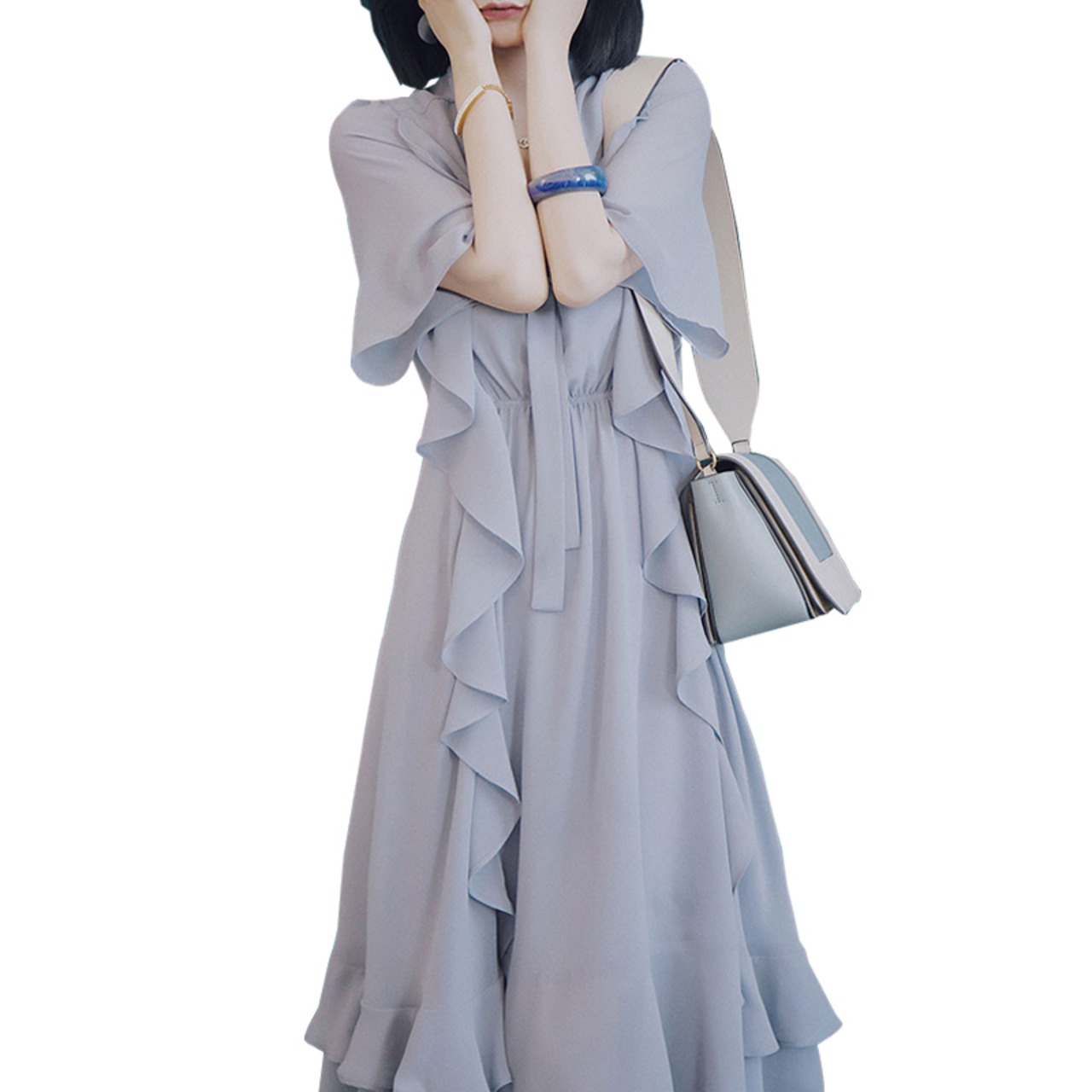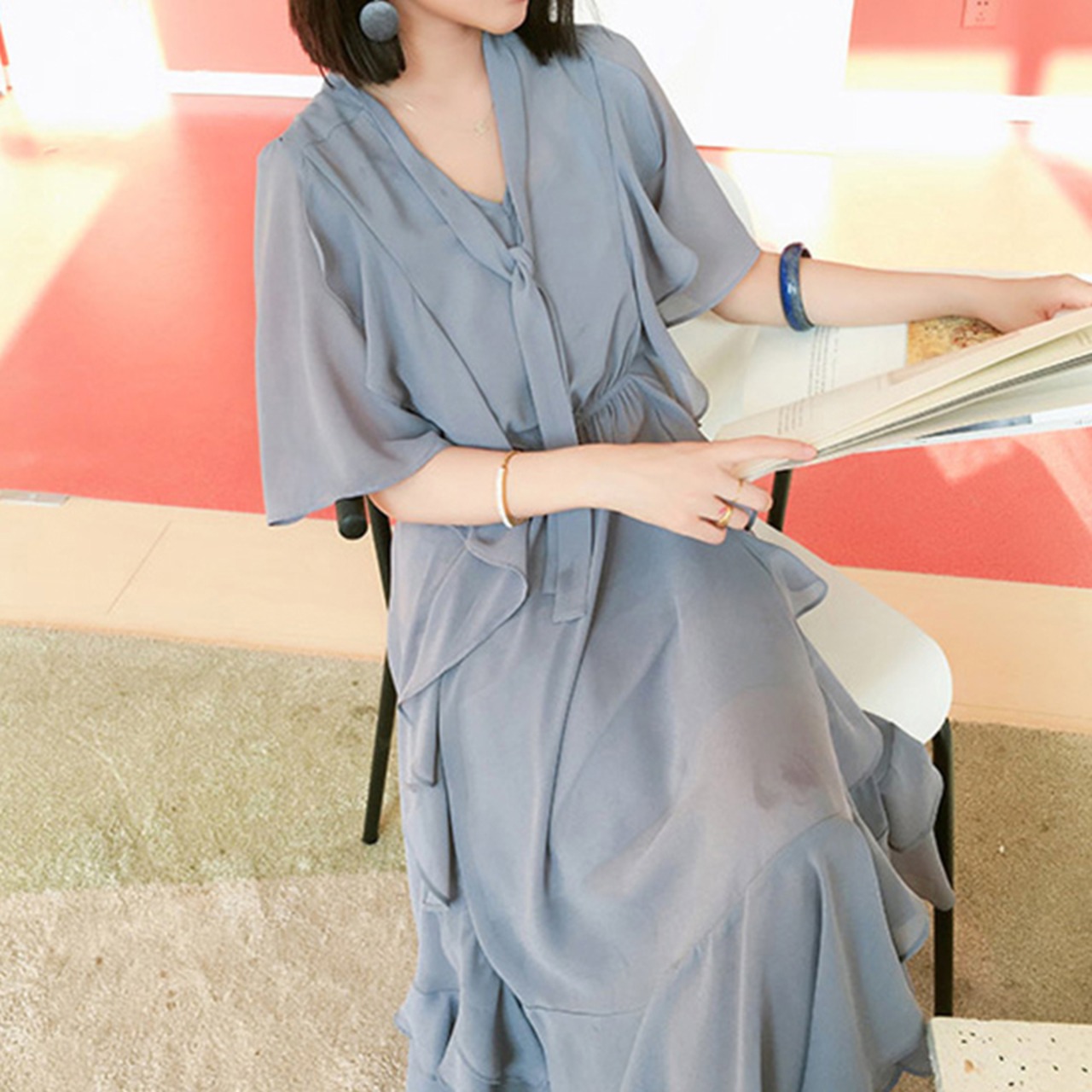 【XL〜5XL】 大きいサイズ レディース ウエスト カバー 夏 ドレス Vネック 半袖 フリル スカート 3l 4l 5l 70482