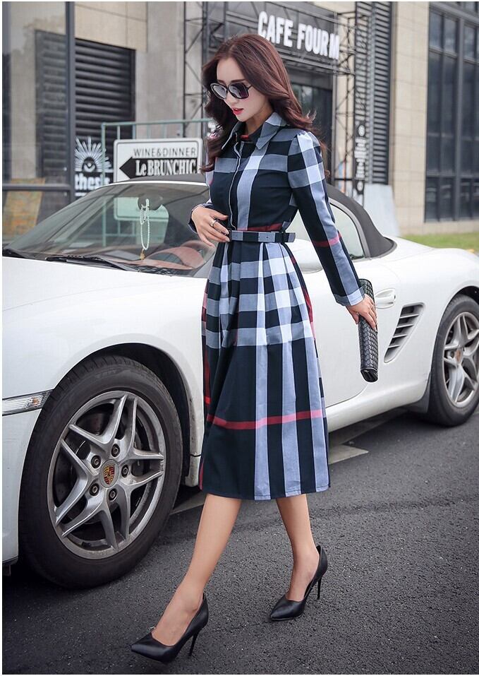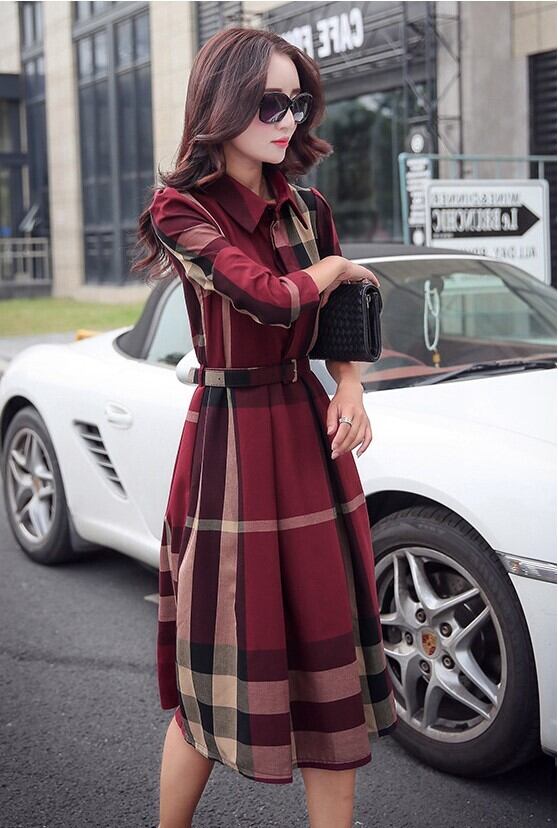 〇 レディースドレス チェック柄 ロングスリーブ ベルト 〇