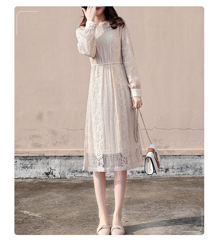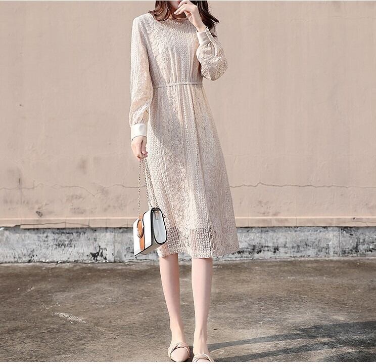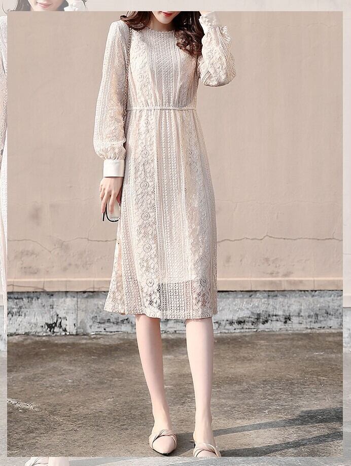 〇 秋 冬 大きいサイズ レース レトロドレス 長袖 ラウンドネック ミドル丈 〇