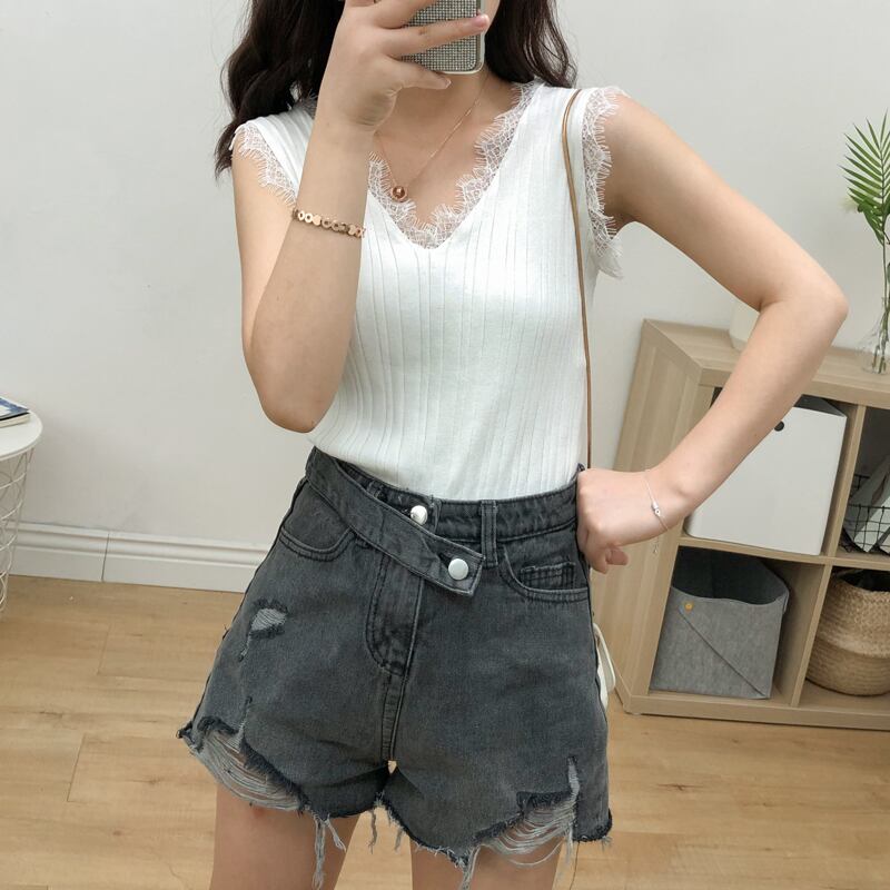 ☆ 夏 フリルレース Vネック キャミソール ストレッチ ボトム シャツ ☆