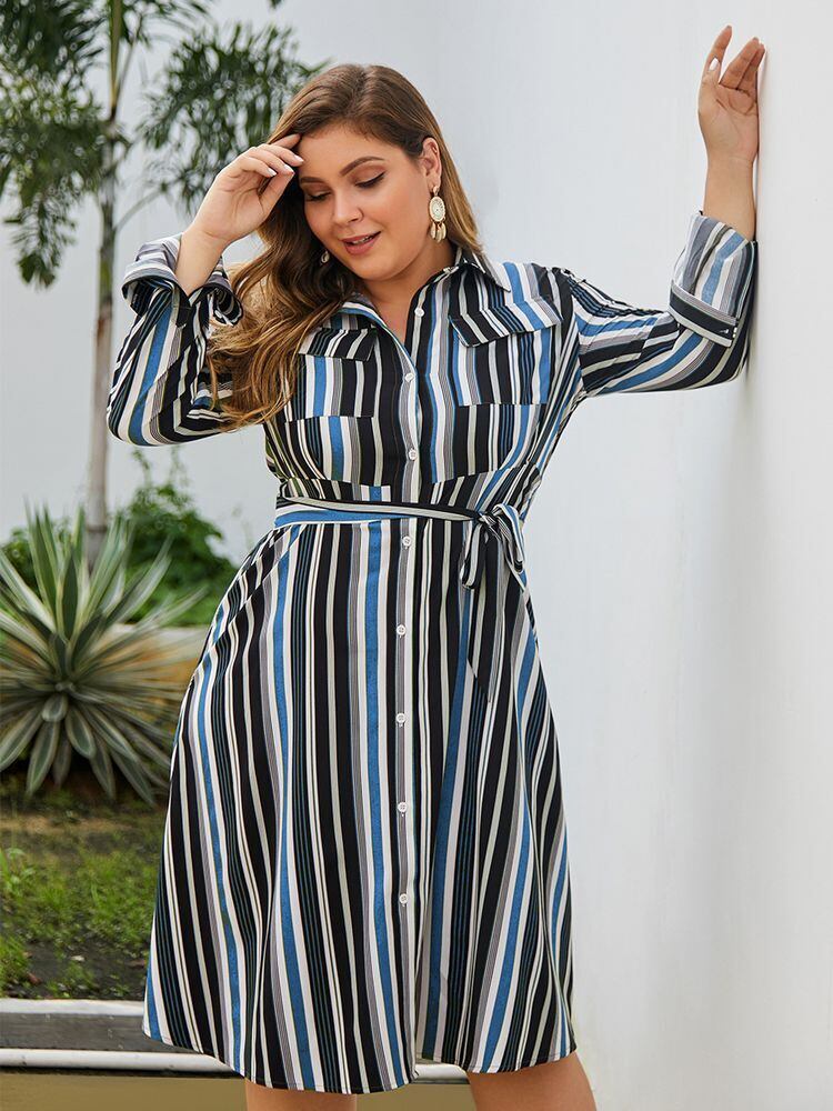 【 XL 〜 4XL 】 大きいサイズ レディース ストライプ ミドル丈 ワンピース シャツ ボタン ポケット ドレス 2XL 3XL 70952
