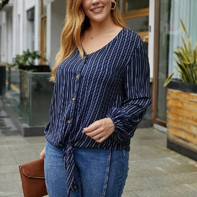 ● プラスサイズ ストライプ ブラウス ロングスリーブ ボタン シャツ ●