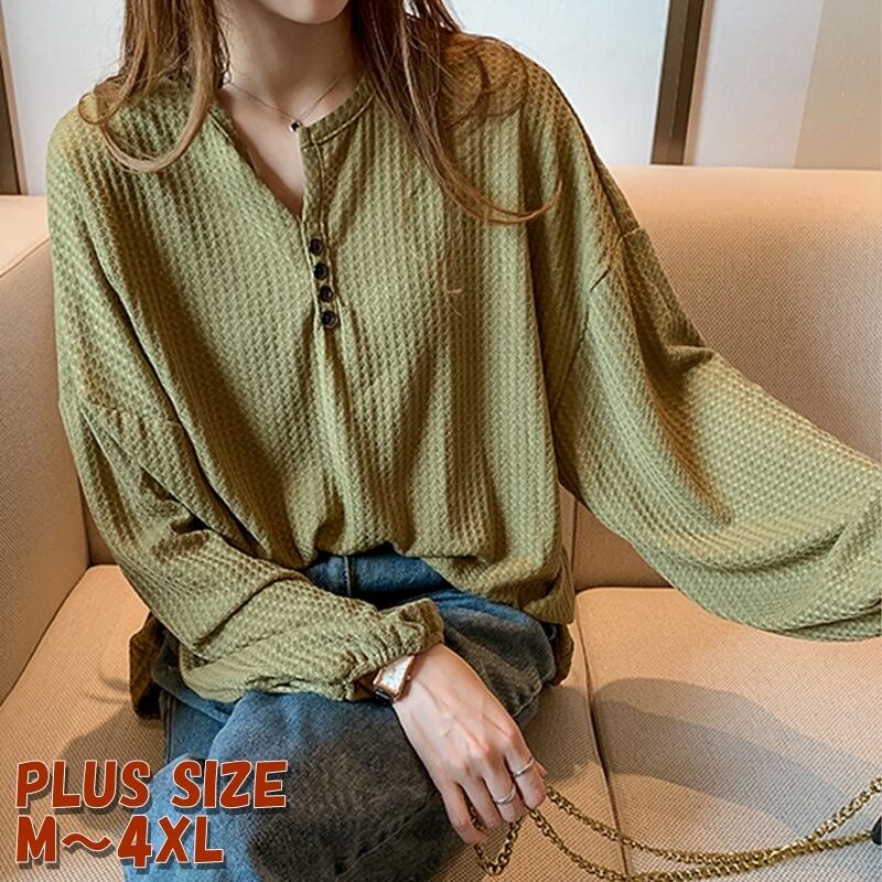 大きいサイズ レディース ?ネック 長袖 ゆったり シャツ tシャツ ボタン 長袖シャツ シャツワンピ ボタン plussize 4XL 3XL 2XL 71000
