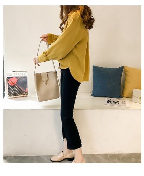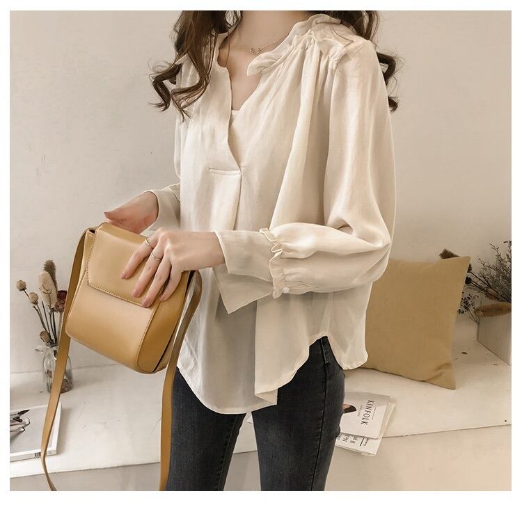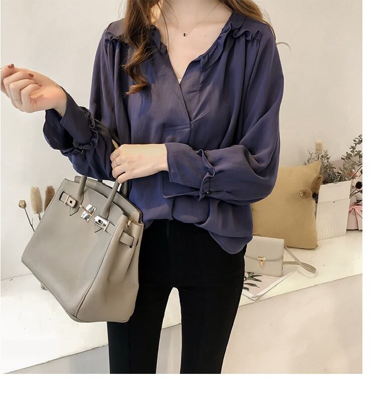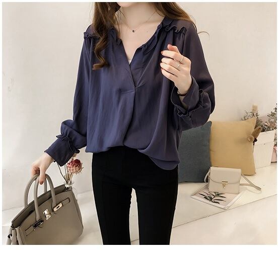 ★ プラスサイズ 春 夏 vネック フリル付き長袖 シャツ ★