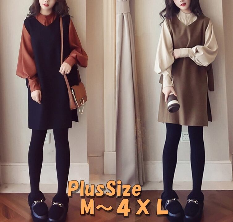 ★ ビッグサイズ 2ピース レディース エアロスリーブ シャツ 秋 冬 スカート ドレス ★