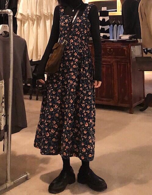 フリーサイズ 大きいサイズ レトロ サスペンダー ロング ドレス ノースリーブ 花柄 秋 スカート お出かけ レディース 71069