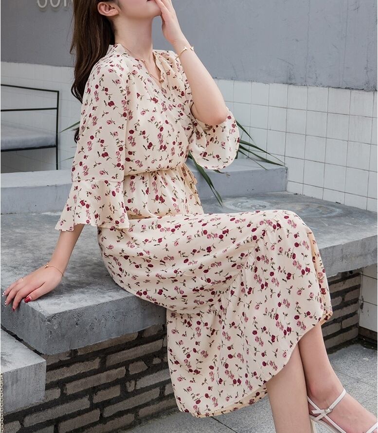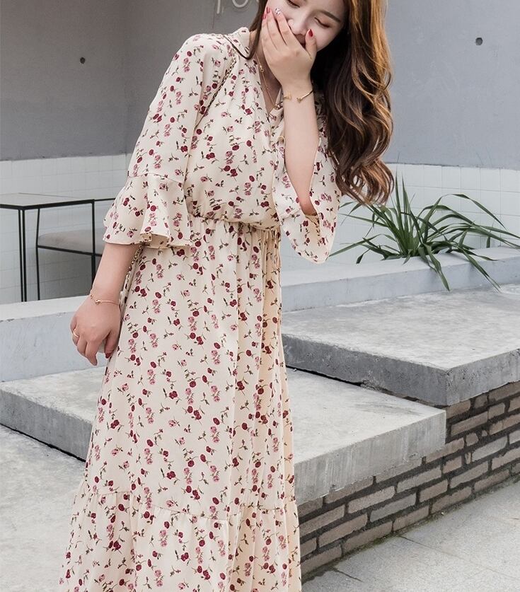 大きいサイズ レディース フローラル vネック 長袖 ドレス 花柄 カジュアル ロングスカート ワンピース S M L XL 2XL 3XL 4XL 70984