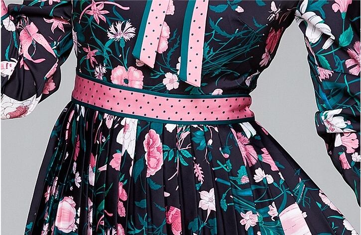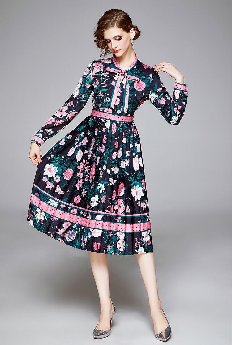 【 M 〜 2XL 】 大きいサイズ 長袖 花柄 プリント ドレス 長袖 ボトミング プリーツ スカート レディース XL L M 71090