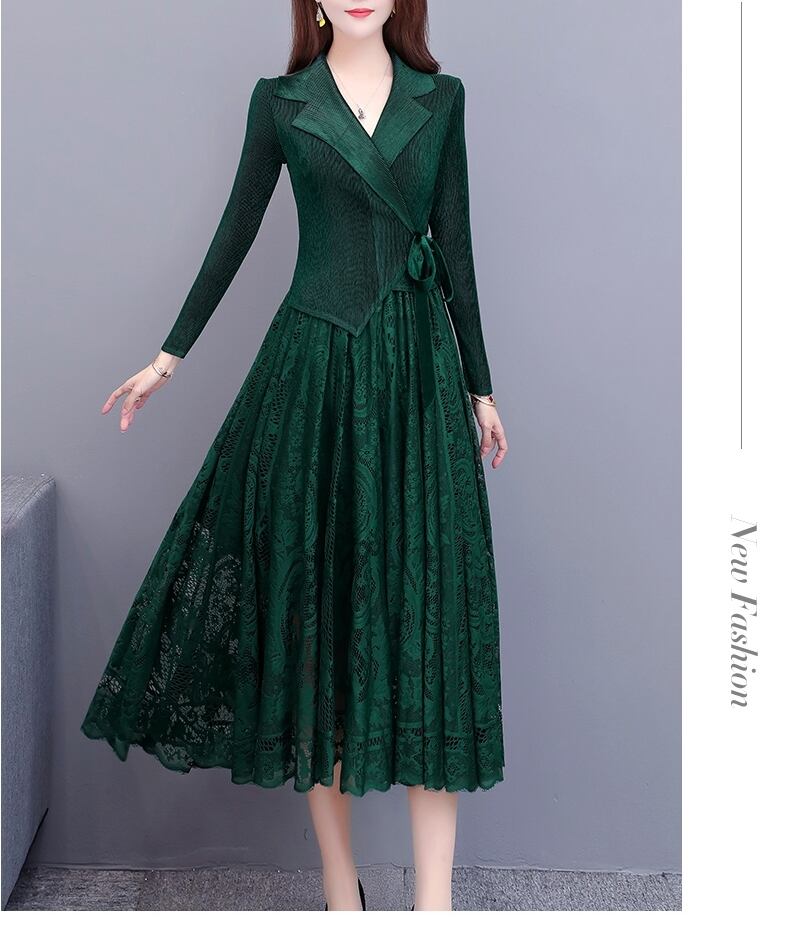 【 M 〜 4XL 】 大きいサイズ レース プリーツ ドレス ウエスト ストレッチ 長袖 レディース スーツ ワンピース 3XL 2XL XL 71101