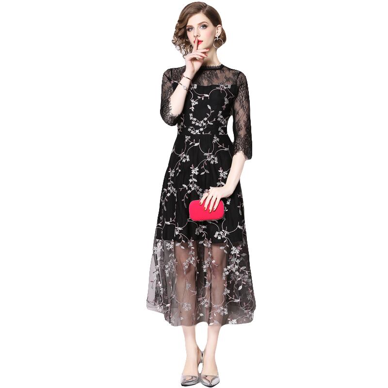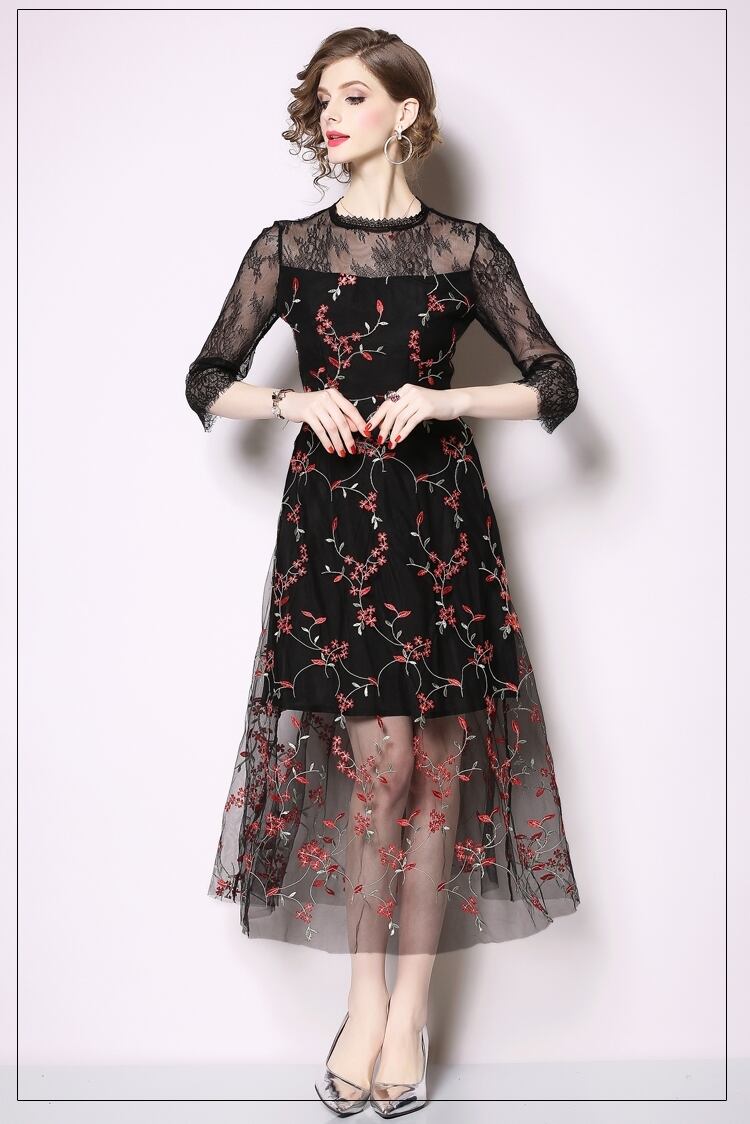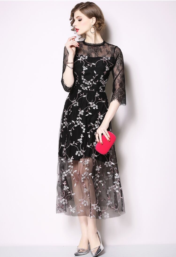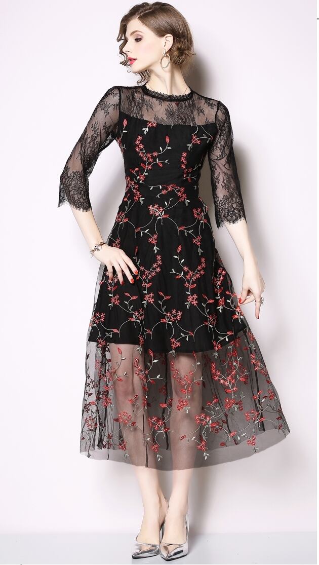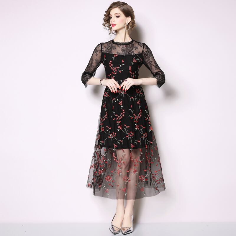 【 S 〜2XL 】 大きいサイズ ミドル メッシュ 刺繍 七分袖 ワンピース レトロ レディース XL L 71118