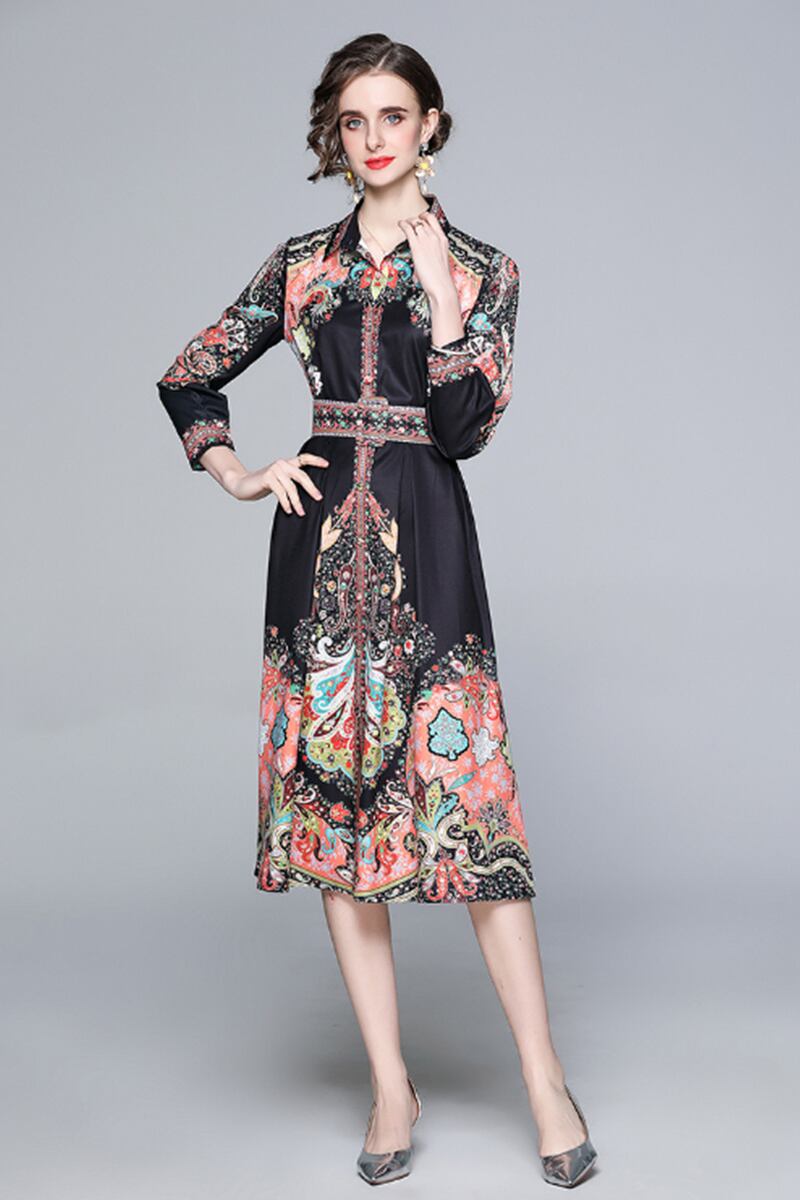 【 M 〜 2XL 】大きいサイズ ロングスリーブ プリント ミディ スカート シャツ ドレス レトロ エレガント XL L 71155