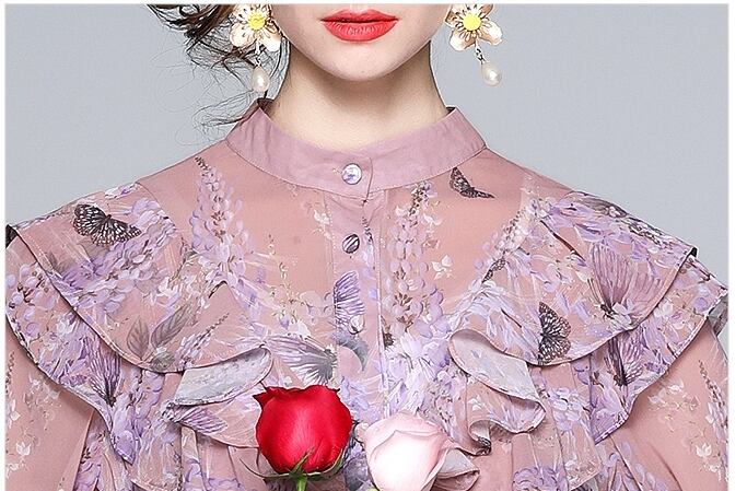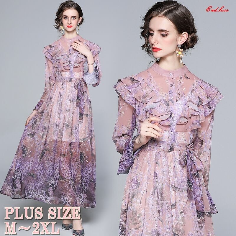 【 M 〜 2XL 】大きいサイズ レディース 春新作 花柄 ラベンダー フリル ロング スカート ドレス 演奏会 パーティー2l L 71160