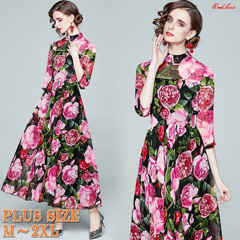 ◆ プラスサイズ レトロな花柄 ハイネック ロング スカートドレスです。