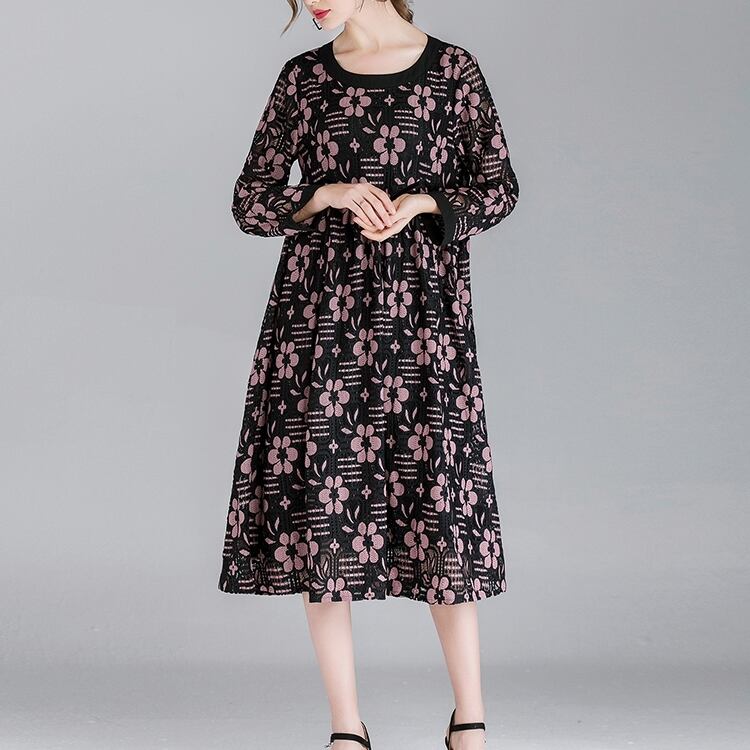【 2XL 〜 4XL 】 大きいサイズ レディース 花柄 レース ステッチ 長袖 ゆったり ドレス カジュアル ワンピース 4l 3l 2l 171