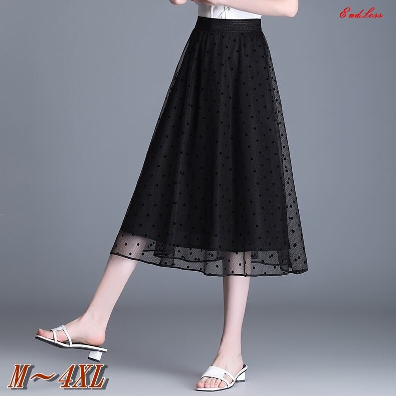 【 S 〜 4XL 】 大きいサイズ レディース 春 夏 ドット メッシュ ハイウエスト ミディ丈 プリーツ スカート 4l 3l 2l 191