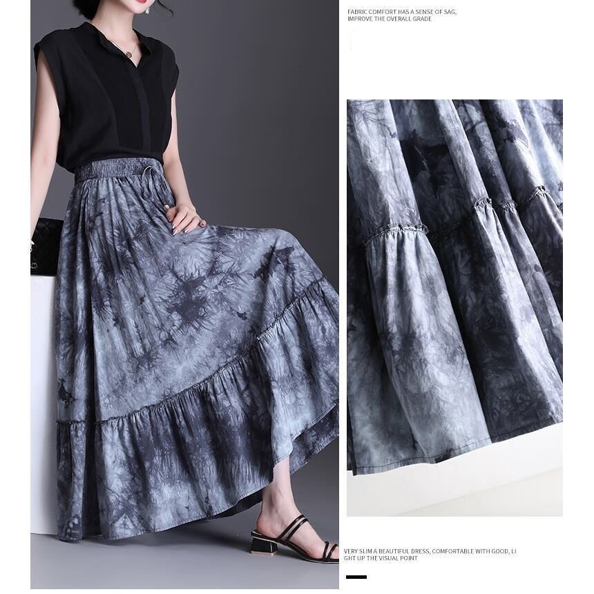 【 ワンサイズ 】 大きいサイズ レディース プリント スイング スリム ダークグレー 春 秋 ロングスカート 274