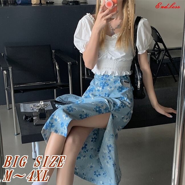 【 M 〜 4XL 】 大きいサイズ レディース 花柄 Aライン ハイウエスト バック ヒップ スリット カジュアル デニム ミディアム丈 ゆったり スカート 4xl 3xl 2xl 285