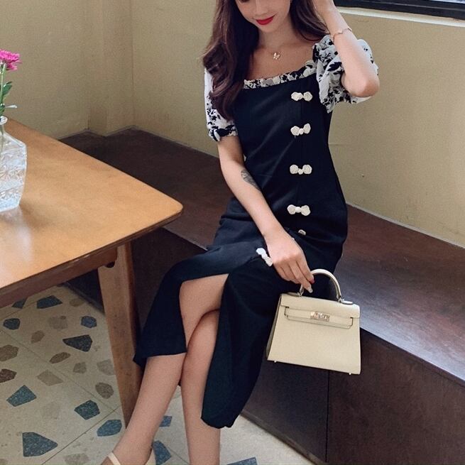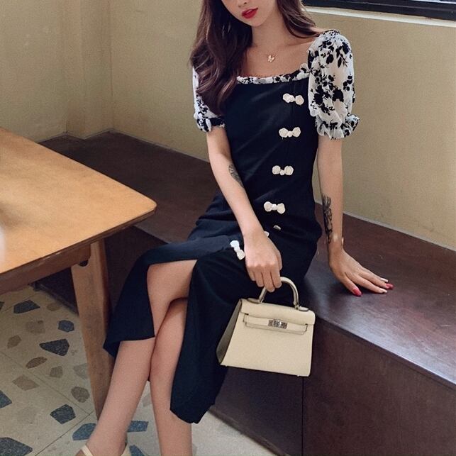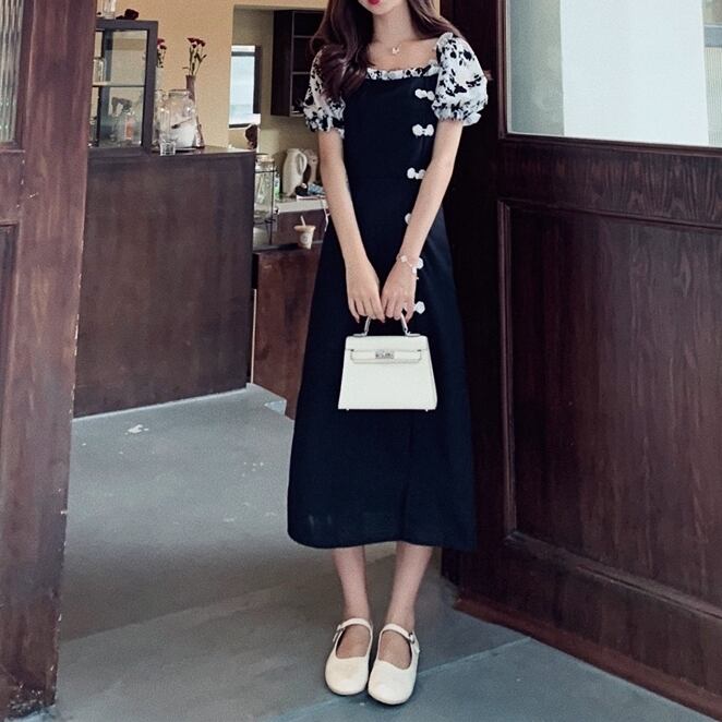 【 M 〜 4XL 】 大きいサイズ レディース 花柄 チャイナ風 ヴィンテージ ワンピース 半袖 バブスリーブ ミディアム スカート レトロ ドレス 4l 3xl 2xl 321