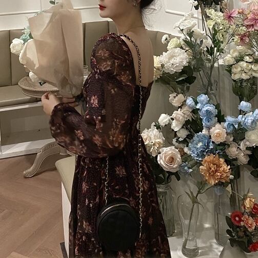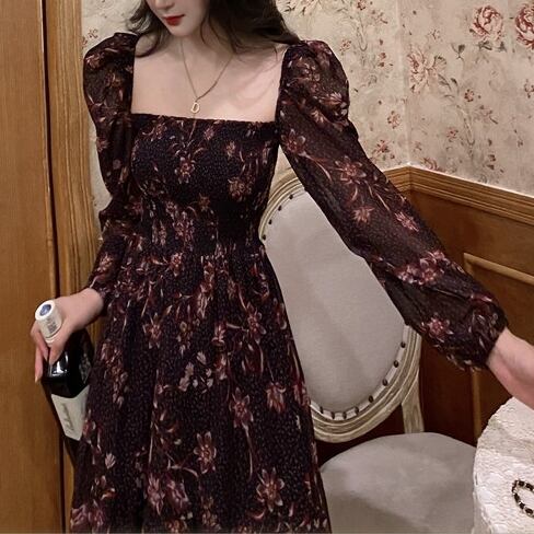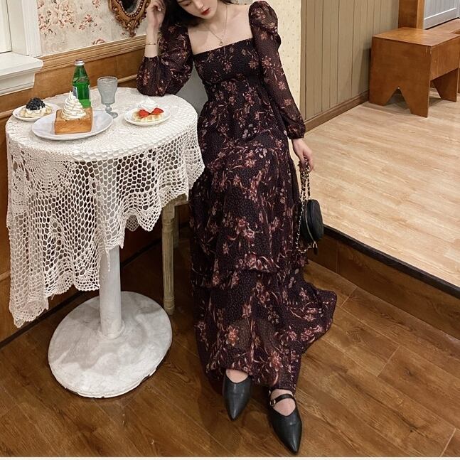 【 M 〜 4XL 】 大きいサイズ レディース 花柄 レトロ 長袖 パーティー ロング ドレス ランタンスリーブ スクエアネック ロングスカート ワンピース 4l 3xl 2xl 325
