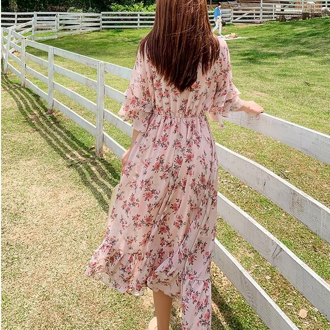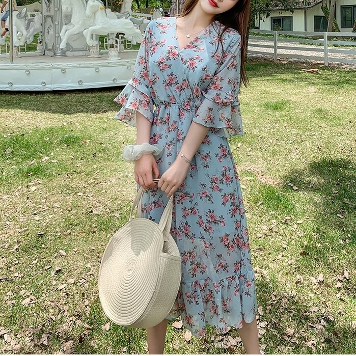 【 L 〜 4XL 】 大きいサイズ レディース 花柄 半袖 ロング ワンピース シャツ ブルー レッド 五分袖 Vネック カジュアル ドレス 4l 3xl 2xl 327