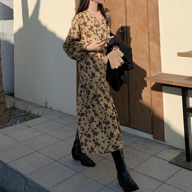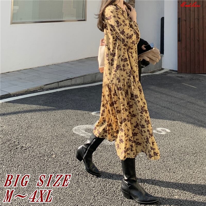 ● プラスサイズ M~4XL 長袖 花柄 ルーズスカート ワンピースです。