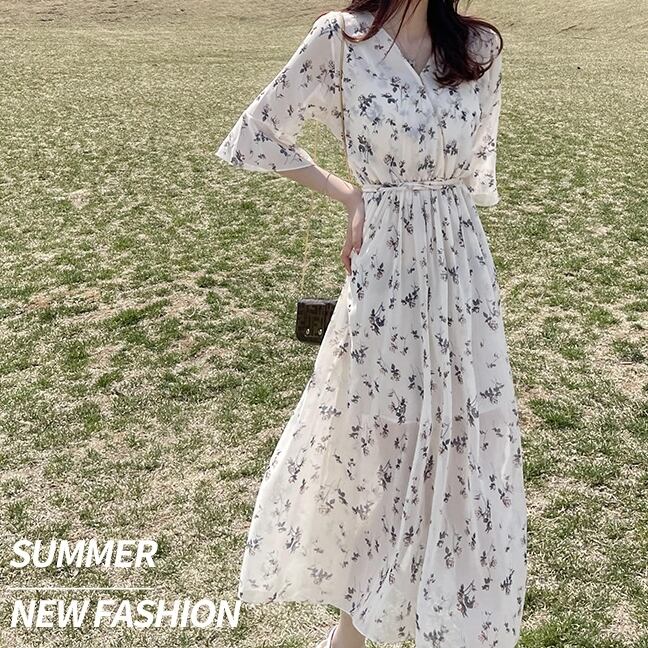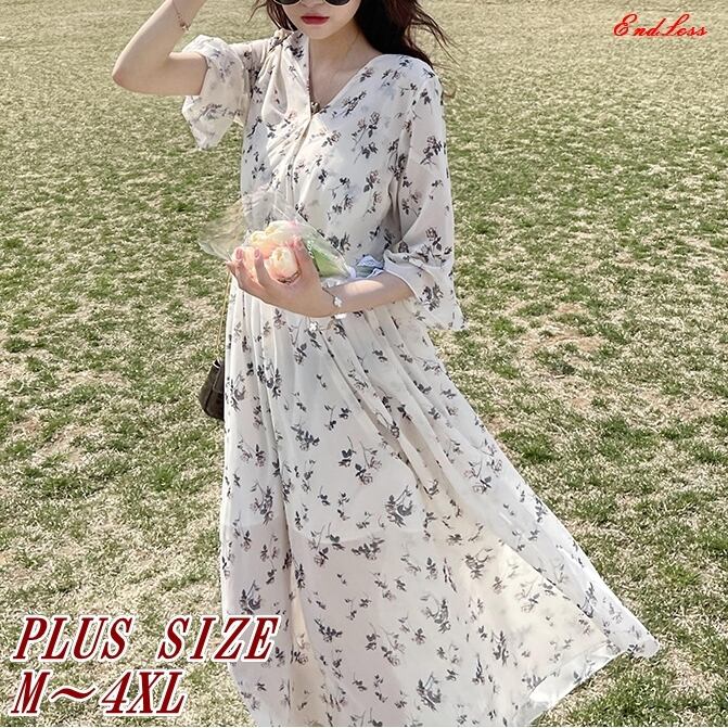 【 M 〜 4XL 】 大きいサイズ レディース Vネック 花柄 ロング スカート ワンピース ドレス 4l 3xl 2xl 343