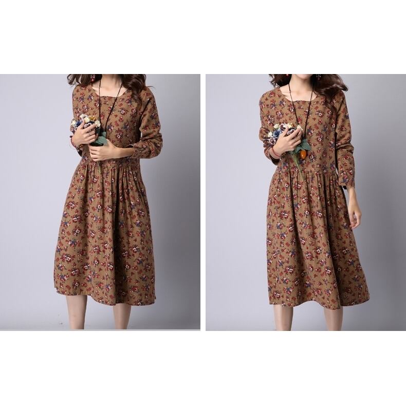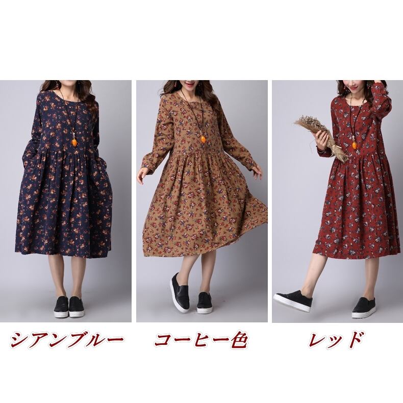 【 M 〜 2XL 】大きいサイズ レディース ルーズ ヴィンテージ ミディアム丈 ワンピース 秋 春 コットン コーデ 長袖 着こなし ゆったり きれいめ かわいい 大人花柄 赤 アウター 346