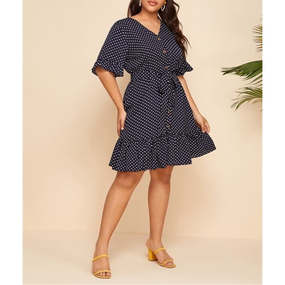 【 S - 3XL 】 レディース ドレス ドット プリント 半袖 ビッグサイズ スカート ワンピース 3l 2l 365