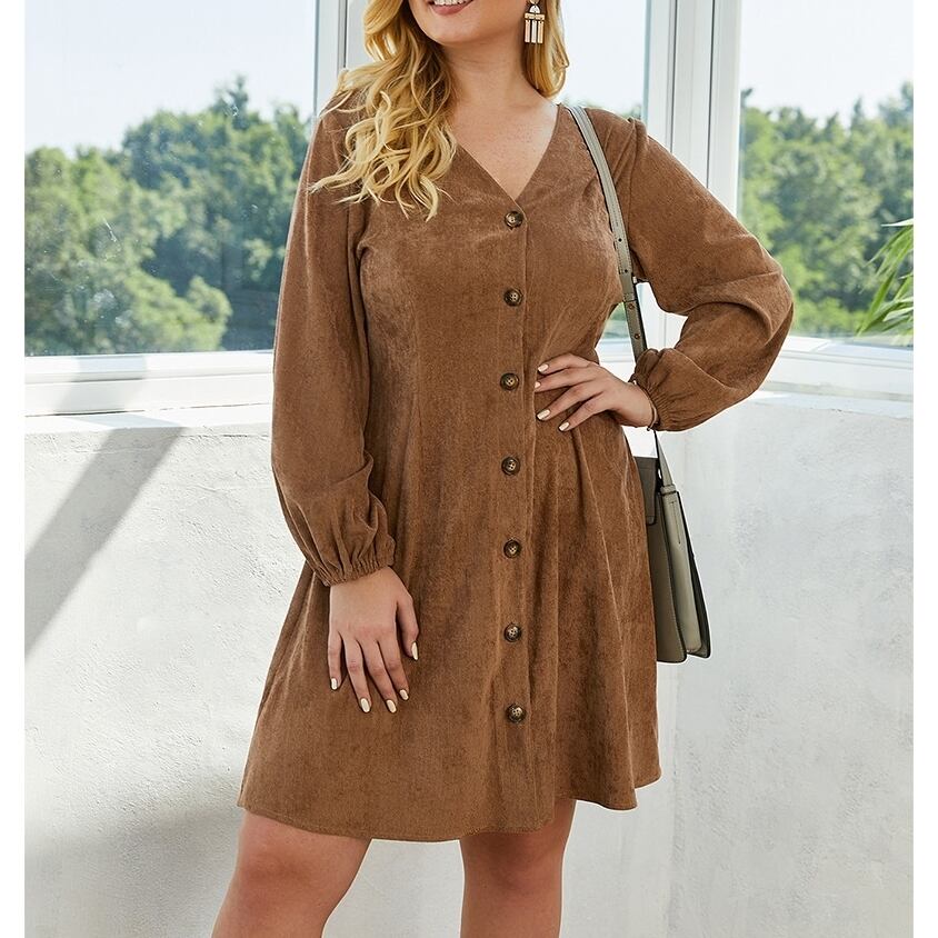 【 2XL - 4XL 】 大きいサイズ レディース Vネック ファッション ドレス 長袖 コーディロイ ゆったり スカート 4l 3l 2l 367