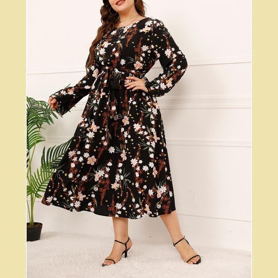 L 〜 4XL 大きいサイズ レディース ゆったり プラスサイズ 長袖 花柄 プリント 秋 ドレス ロングスカート ハイウエスト ぽっちゃり ワンピース ビッグヤード カジュアル ファッション ブラック lady dress long sleeves flower printed dresses for women 通販 XL 3l 2l 4xl 401