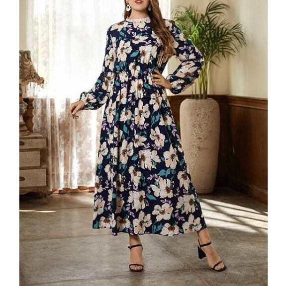 L 〜 4XL 大きいサイズ レディース 花柄 フローラル カジュアル ロング ドレス ワンピース 秋 ファッション ブルー ?women Autumn dresses 通販 XL 4XL 3l 2l 409