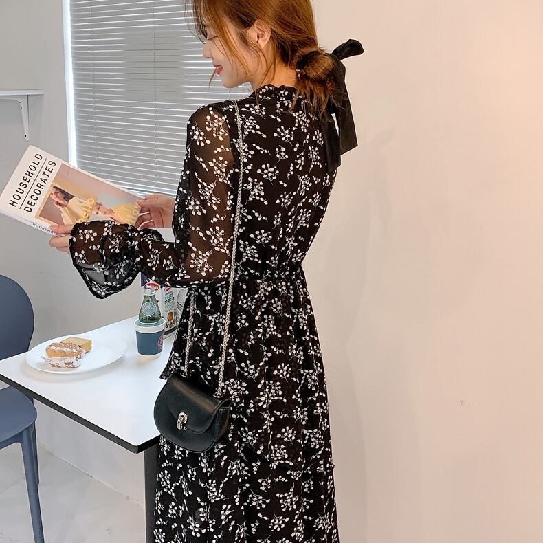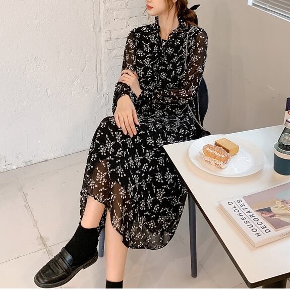 S 〜 4XL 大きいサイズ レディース 花柄 フローラル 長袖 ビッグサイズ レトロ ロング ドレス ワンピース 春 秋 レトロ ファッション ブラック ゆったり カジュアル 通勤 オフィス ミディアムロング ミディアムスカート ロングスリーブ Vネック ?plus size autumn ladies dress 通販 XL 4XL 3l 2l 412