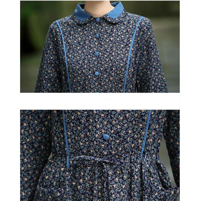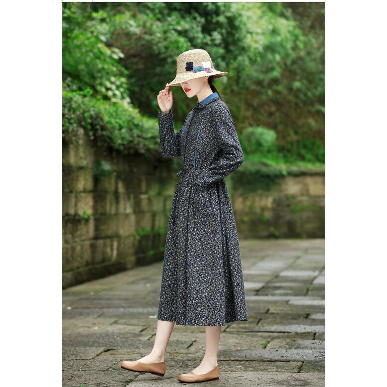 XL 〜 2XL 大きいサイズ レディース フローラル ドレス レトロ エスニック ラージサイズ ワンピース 長袖 Vネック コットン リネン ロング スカート オフィス 通勤 カジュアル ミドルウエスト Plus size autumn ladies 通販 XL 2l 417