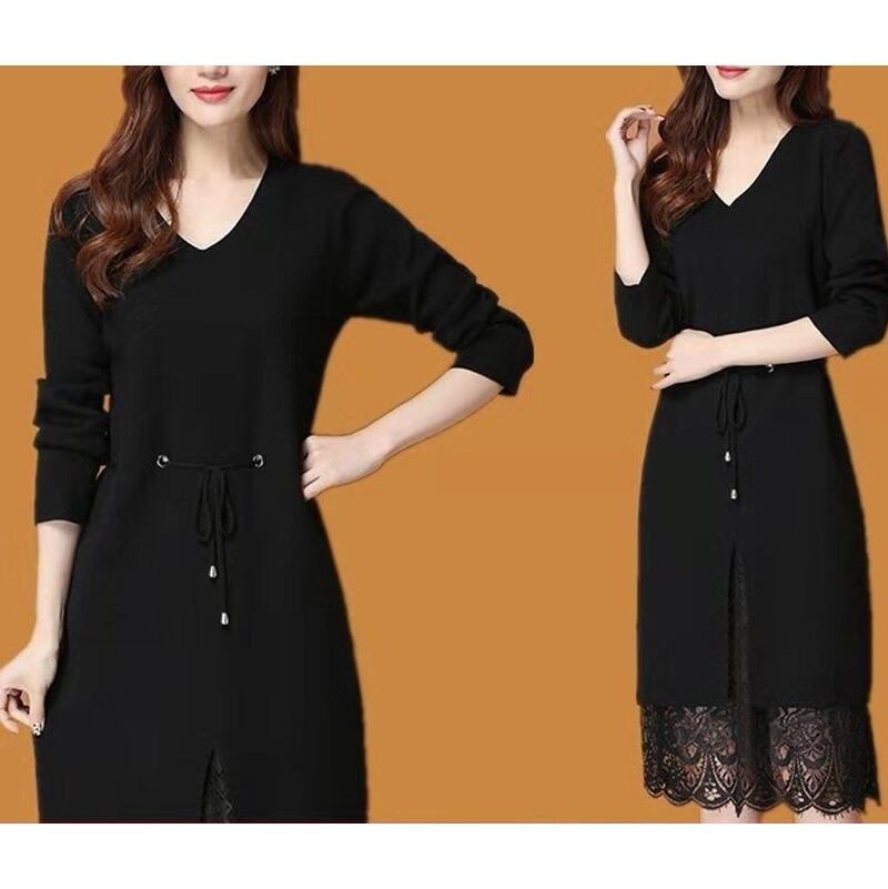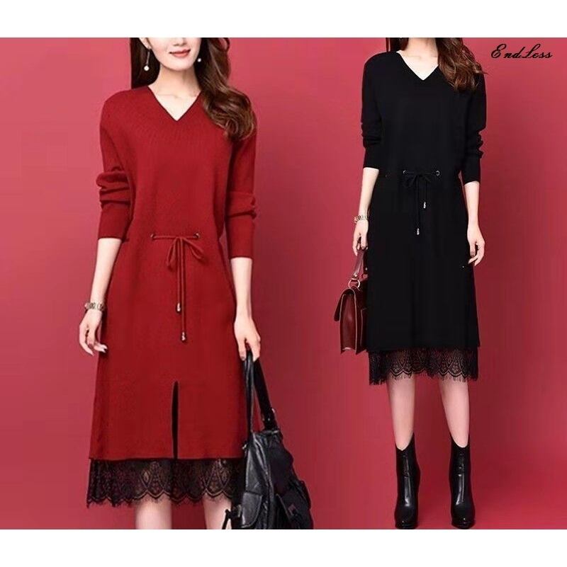 M 〜 3XL 大きいサイズ レディース 長袖 Vネック ニット レース セーター スカート ドレス ワンピース ラージサイズ カジュアル オフィス 秋 ブラック レッド ファッション Plus size autumn ladies 通販 3l 2l l 4l 421
