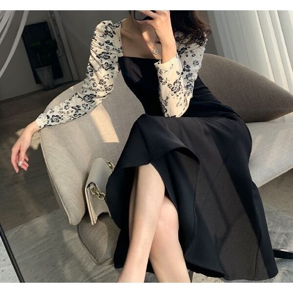M 〜 2XL 大きいサイズ レディース ロングスリーブ バブスリーブ 長袖 ミドル丈 花柄 秋ドレス ワンピース ラージサイズ カジュアル オフィス ブラック ファッション Plus size autumn ladies 通販 2l l 4l 422