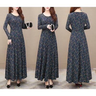 M 〜 5XL 大きいサイズ レディース ラウンドネック スリム ロング ドレス レトロ クラフト プリン後 花柄 フローラル 長袖 ビッグスイング スカート 春 秋 ワンピース ラージサイズ カジュアル オフィス フォーマル ファッション Plus size autumn ladies 通販 3l 2l XL 425