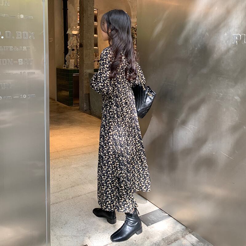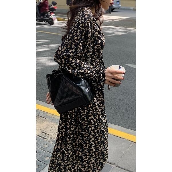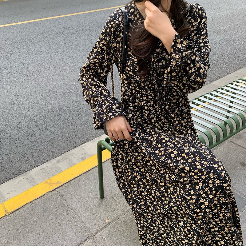 【 ワンサイズ 】 大きいサイズ レディース 春 秋 ドレス ミドル丈 スカート 長袖 花柄 コーデ きれいめ ミドル丈 スカート ワンピース コーデ 大人 Vネック ハイウエスト カジュアル オフィス 秋物 ファッション 通販 428