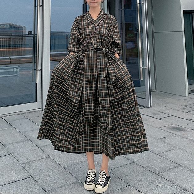 大きい サイズ レディース 長袖 シャツ ドレス チェック柄 Vネック ロング スカート ワンピース きれいめ コーデ 大人 女子 カジュアル オフィス ファッション お気に入り アイテム 通販 ショップ 432