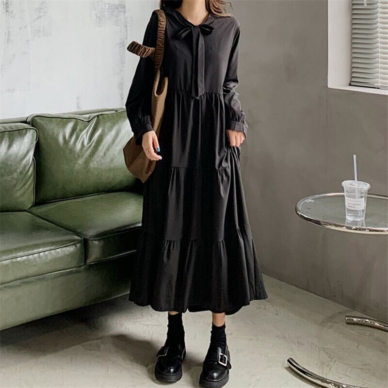 M 〜 4XL 大きい サイズ レディース 秋 冬 服 長袖 ウエスト ゆったり ブラック ロング ワンピース ドレス リボン きれいめ コーデ 大人 女子 カジュアル オフィス ファッション お気に入り アイテム 通販 ショップ 4l 3l 2l 434