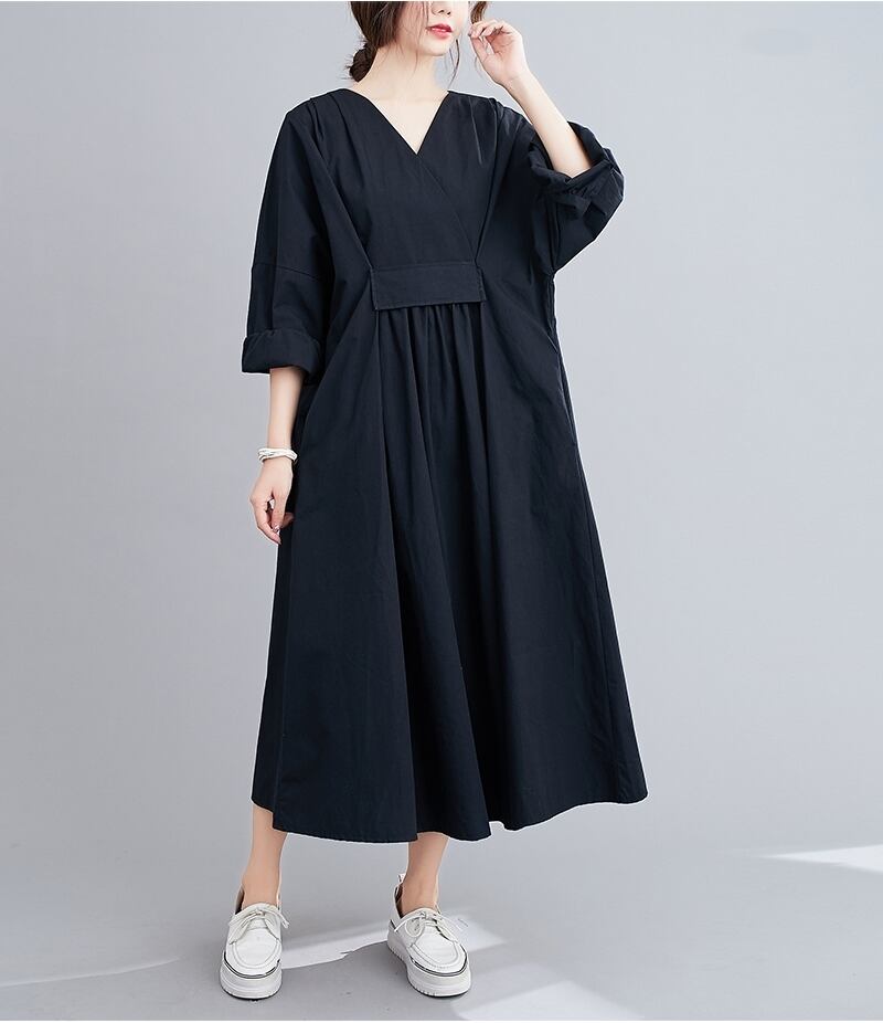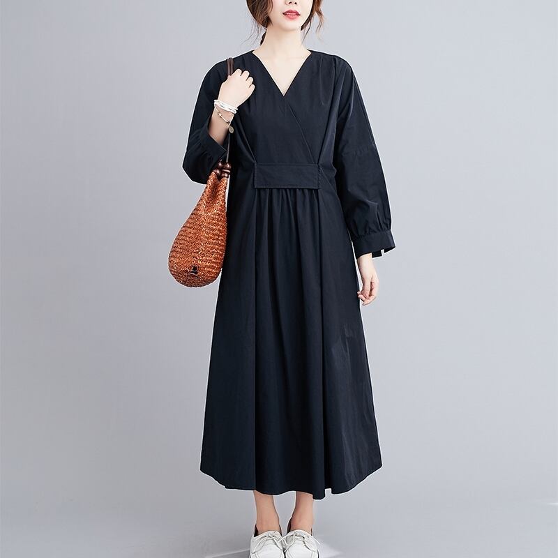 M 〜 2XL 大きい サイズ レディース Vネック ウエスト ゆったり ブラック ロング 長袖 ワンピース きれいめ コーデ 大人 女子 カジュアル オフィス ファッション お気に入り アイテム 通販 ショップ 2l 435