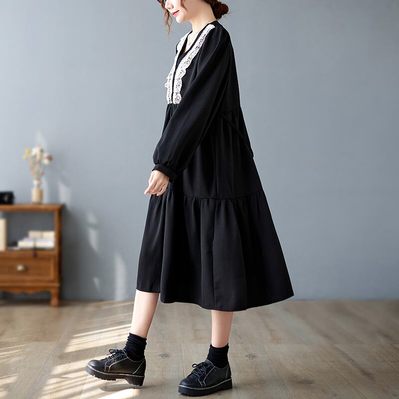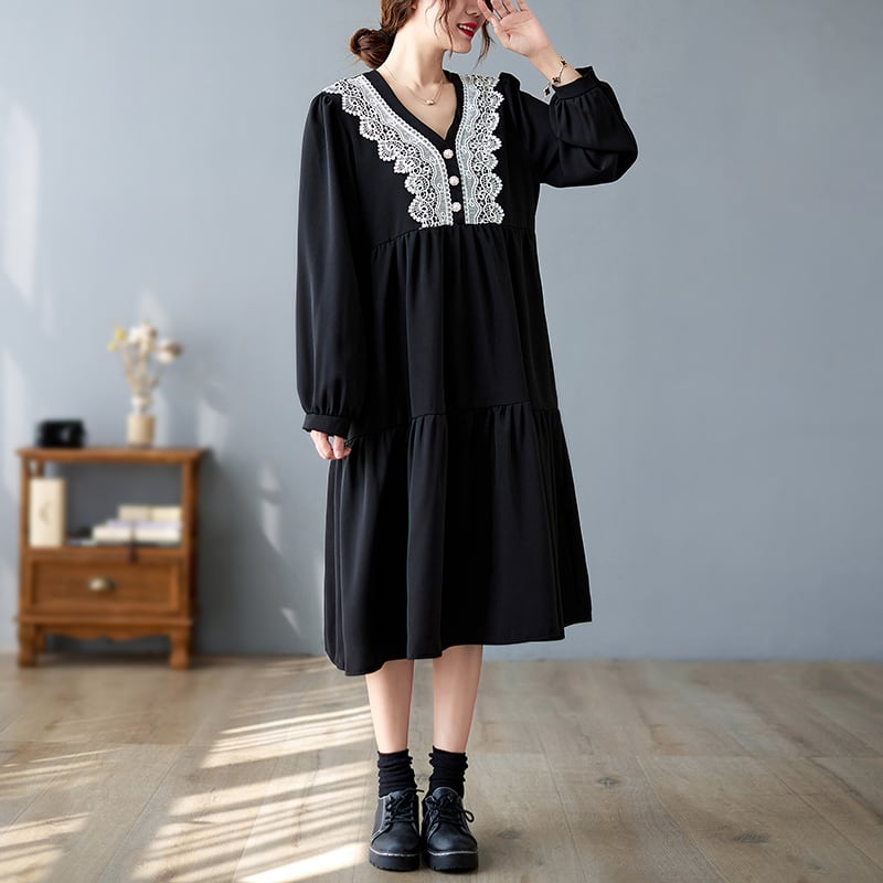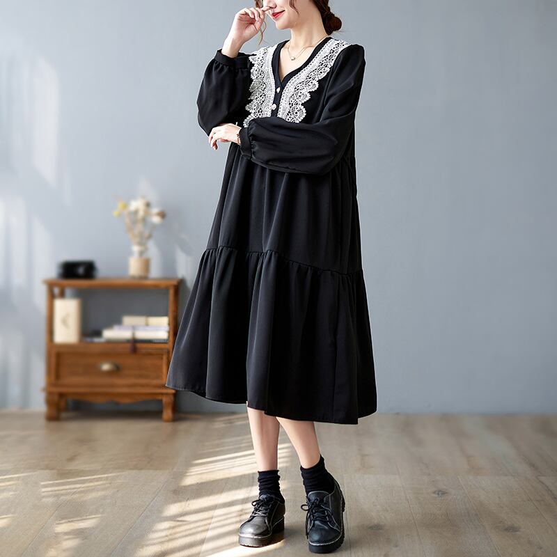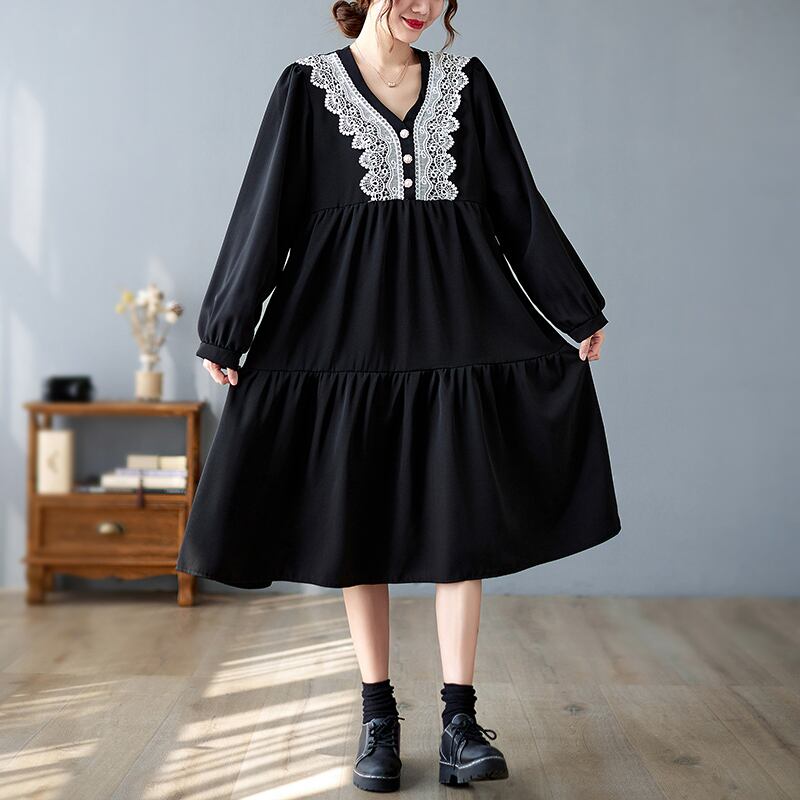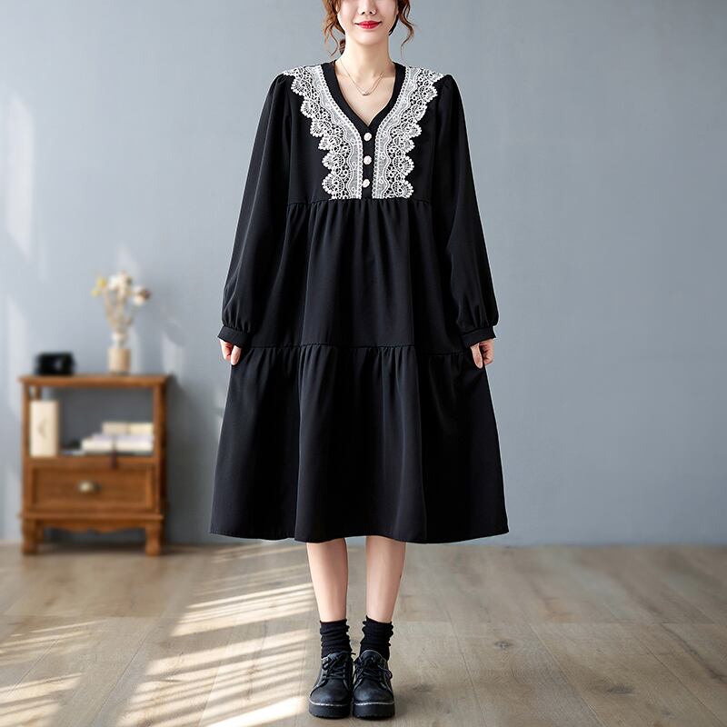 大きい サイズ レディース ロングスリーブ ゆったり 刺繍 ドレス ブラック ワンピース 大人 女子 カジュアル オフィス ファッション お気に入り アイテム 通販 ショップ 453