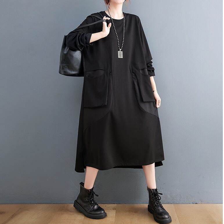 大きい サイズ レディース ブラック 長袖 ミディアム スカート ゆったり ウエストカバー ワンピース ポケット付き コーデ カジュアル ファッション お気に入り アイテム 通販 456