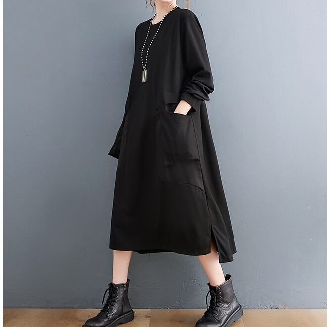 ● 長袖 ミディアムスカート ブラック ポケット付き ゆったり ワンピースです。